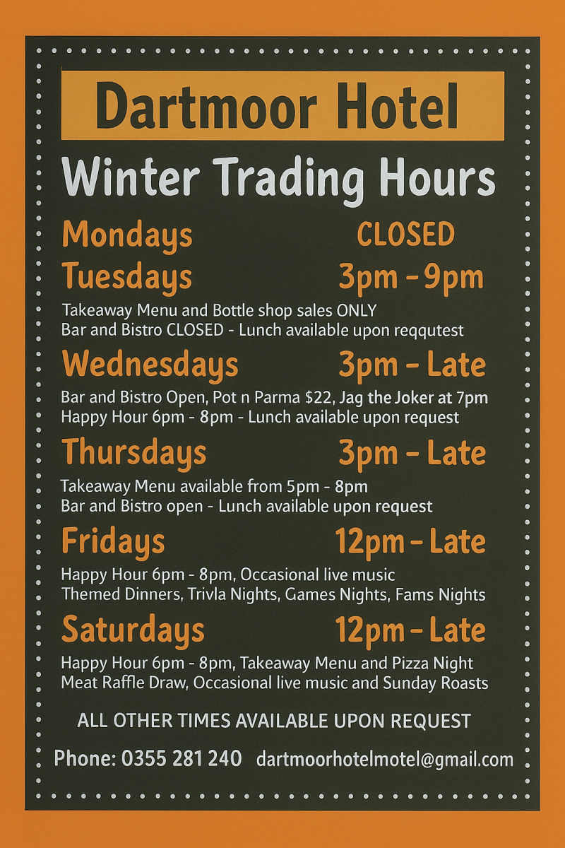 Dartmoor Hotel Motel is a family-owned business dedicated to providing exceptional hospitality to all our guests. With a commitment to quality meals and comfortable accommodation, we aim to create memorable experiences for everyone who walks through our doors.